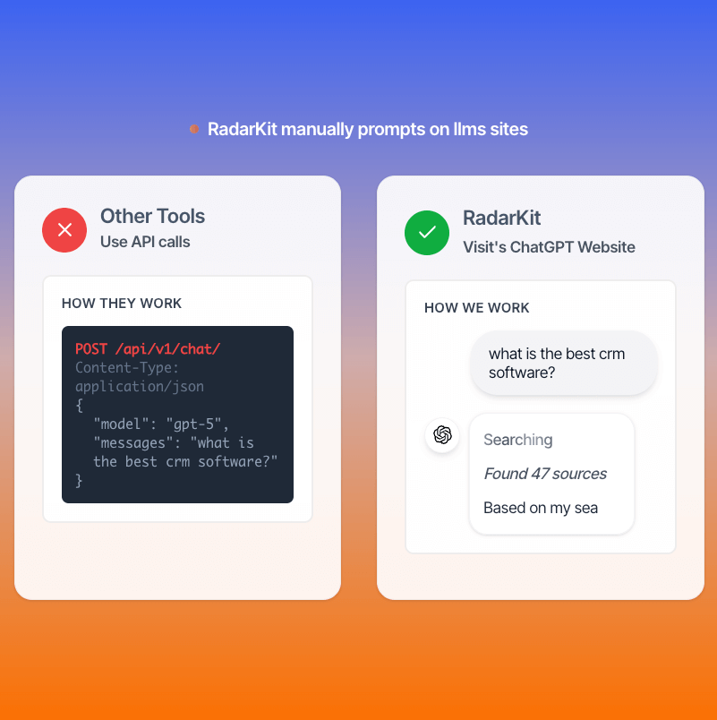 We do not use APIs. We track manually to mirror real user behavior. APIs often return different outputs and skip live web search. That hides citations and mentions.